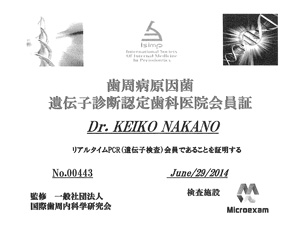 当院では「歯周病原因菌DNA検査」を受けることができます。この検査は、患者さまのお口の中に歯周病原因菌がどのくらいいるのかを調べるものです(人間のDNAを調べるのではなく、歯周病菌のDNA検査です)。一部の歯周病原因菌は位相差顕微鏡で調べることができましたが、歯周病原因菌DNA検査ではそれ以外の悪玉菌を調べることが可能です。ご興味がある方は、スタッフにお申し出ください。