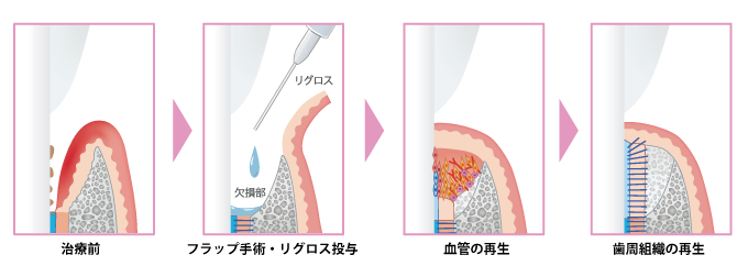 リグロスは、歯周病によってダメージを受けた歯周組織の周囲にある細胞に対して増殖促進作用があり、血管新生を促進します。増殖した細胞は骨芽細胞、セメント芽細胞へと分化します。これらの作用により、歯槽骨などの歯周組織が再生されます。